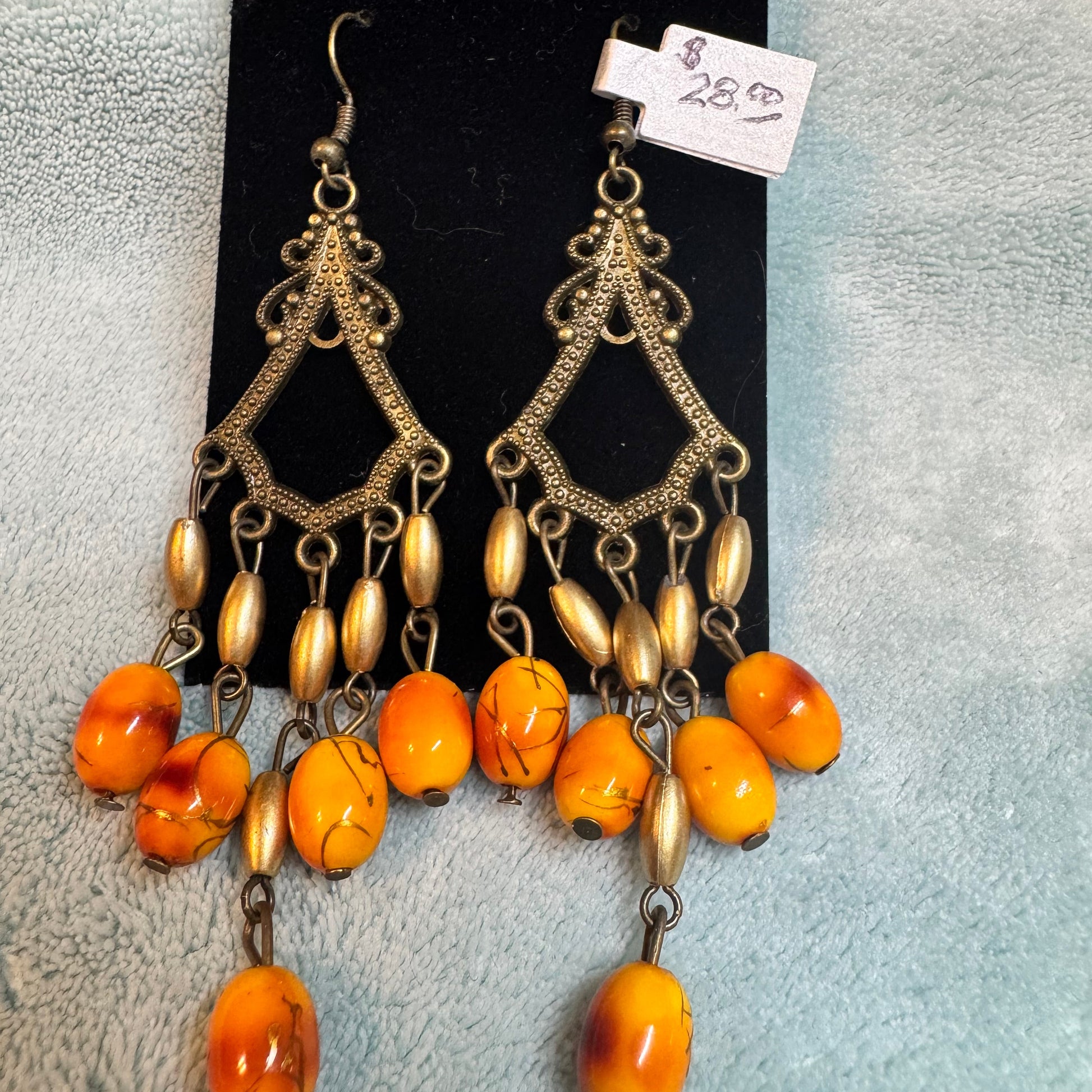 Bronze dangle earrings, with orange dyed shells.